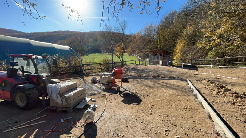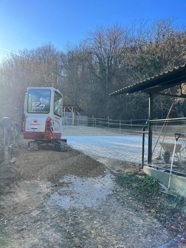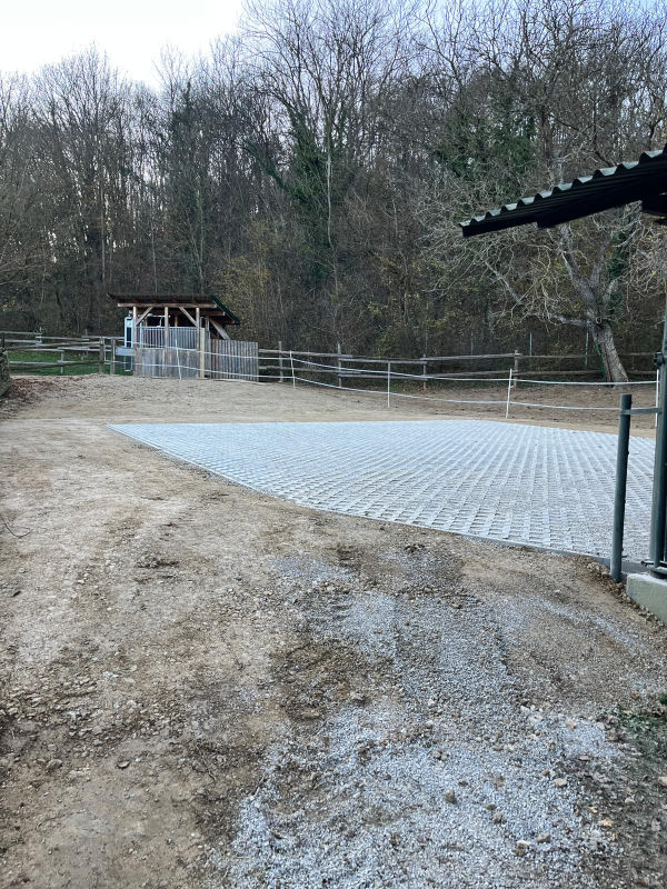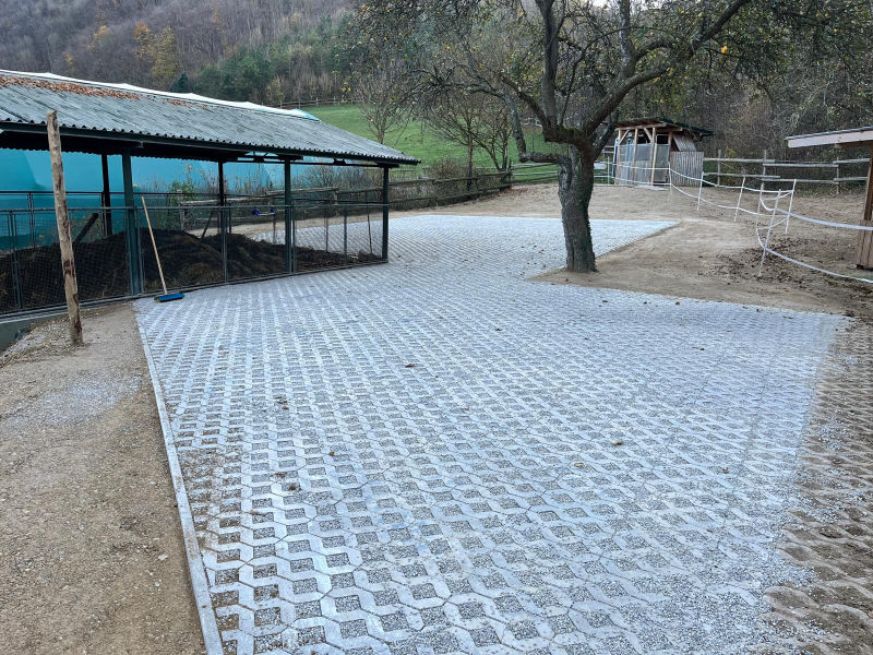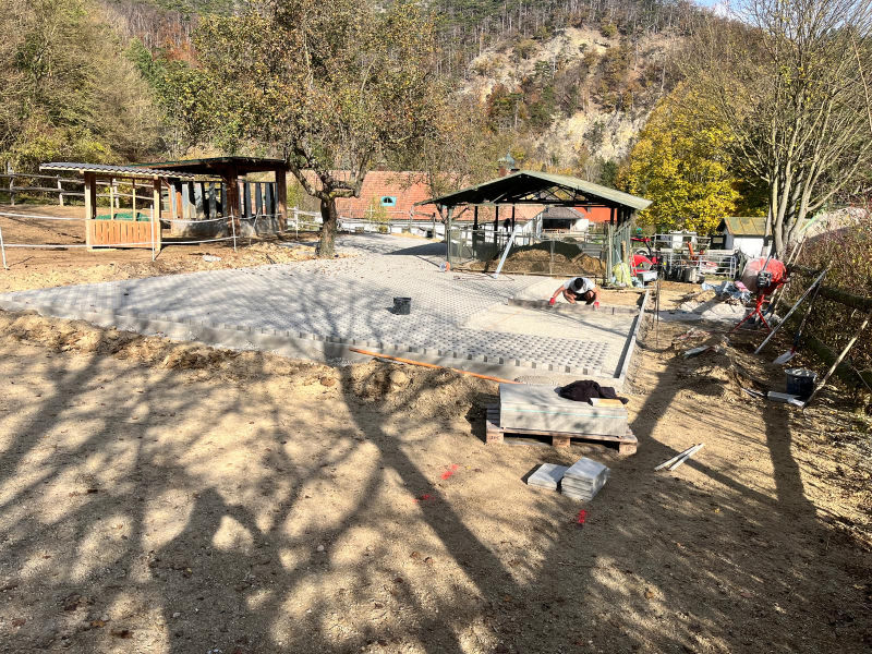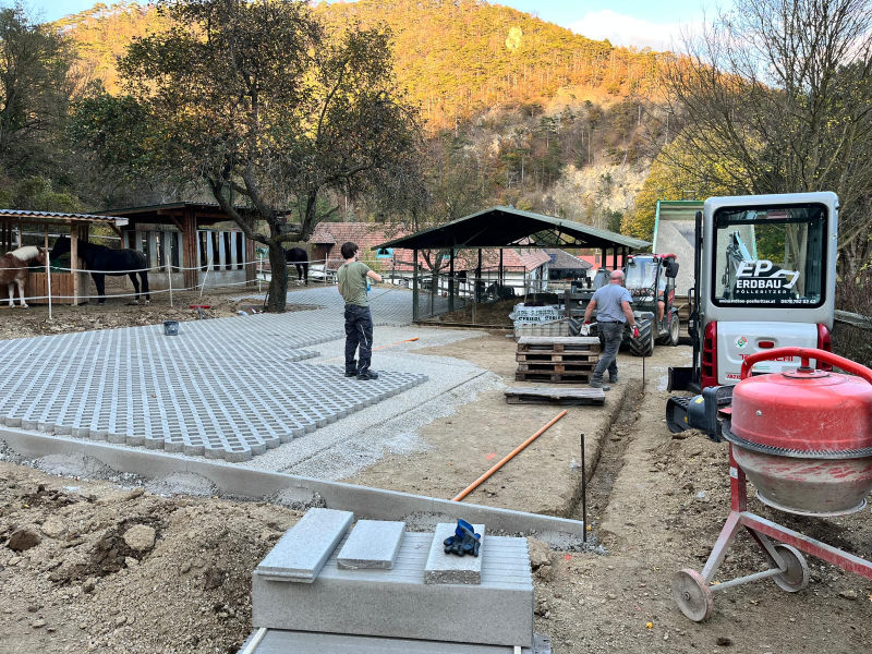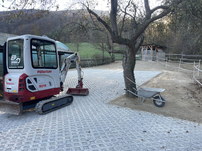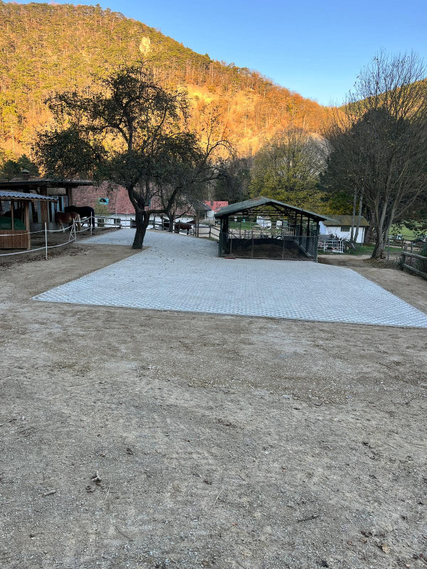 Für einen Pferdehof wurde ein befestigter Auslauf aus Rasengittersteinen angelegt. Zuerst musste die Humusschicht abgetragen und ein tragfähiger Untergrund aus Grädermaterial angeschüttet und verdichtet werden. Die Auslauffläche wurde mit Randsteinen eingefasst und danach wurden die Rasengittersteine in Rollsplitt verlegt und verfüllt.