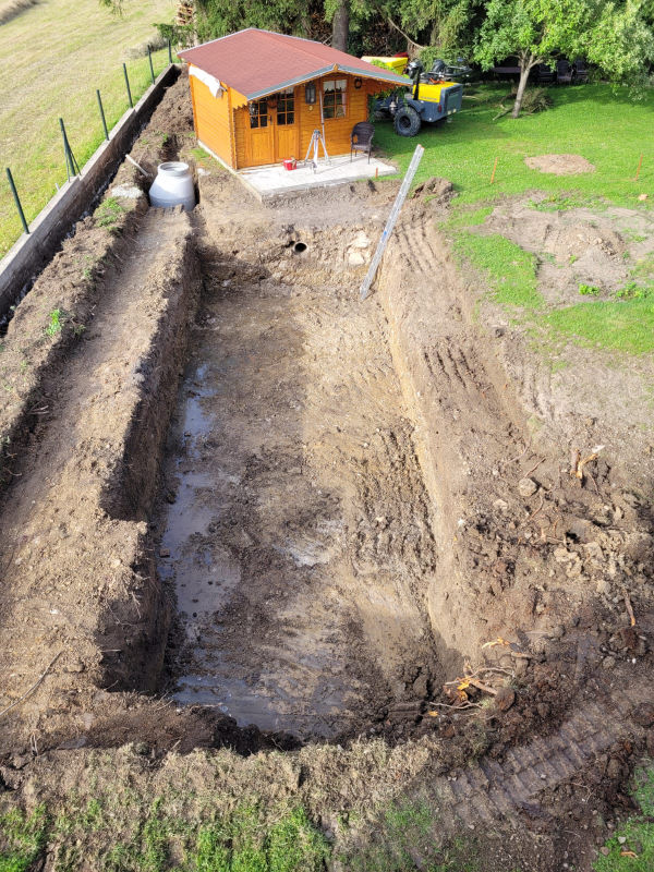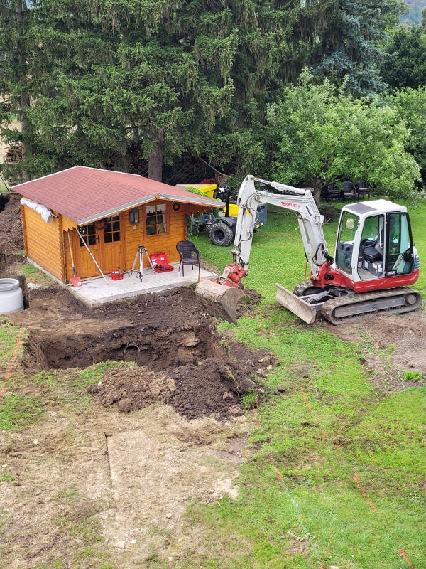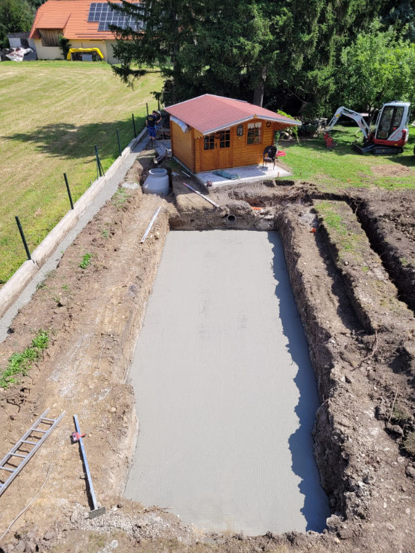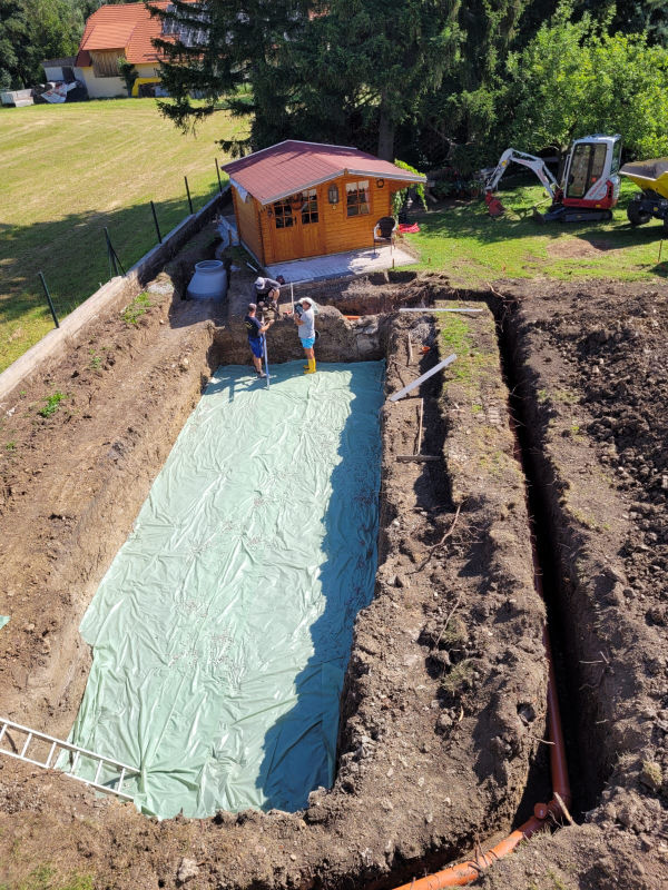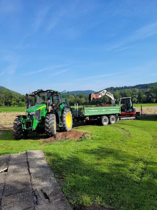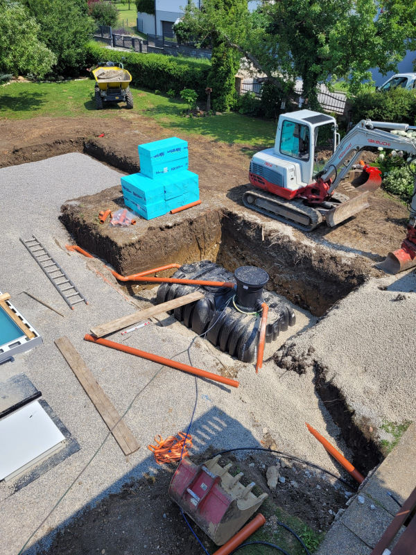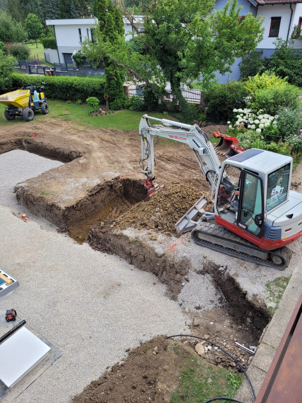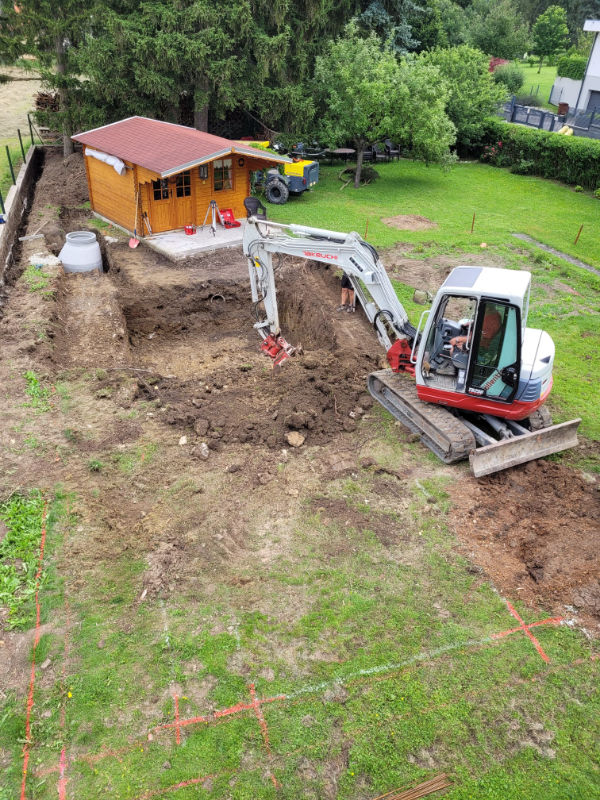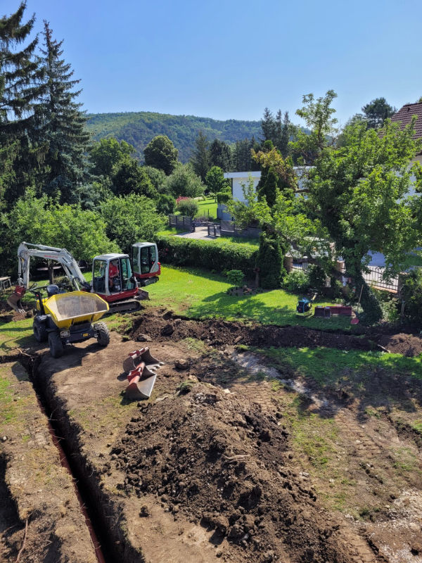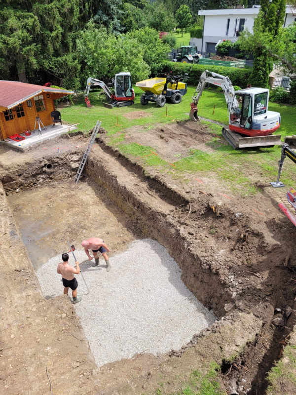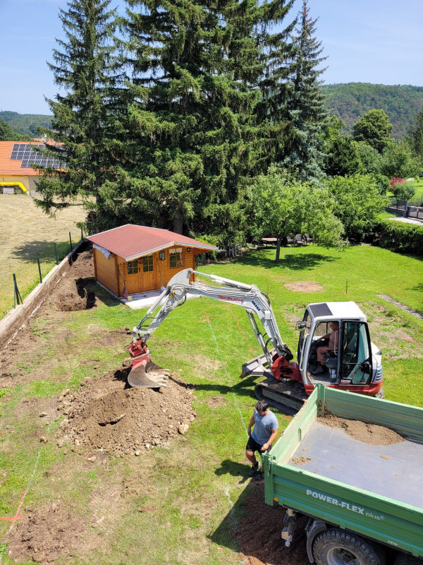 Hier wurde ein Swimmingpool samt Regenwasserzisterne und Kanalisation fachgerecht, geplant, vorbereitet und umgesetzt. Rund um das fertige Pool wurde auch noch der Untergrund für die Verlegung der Terrassenplatten vorbereitet. Das Aushubmaterial wurde mittels Dumper und Kipper entsorgt.