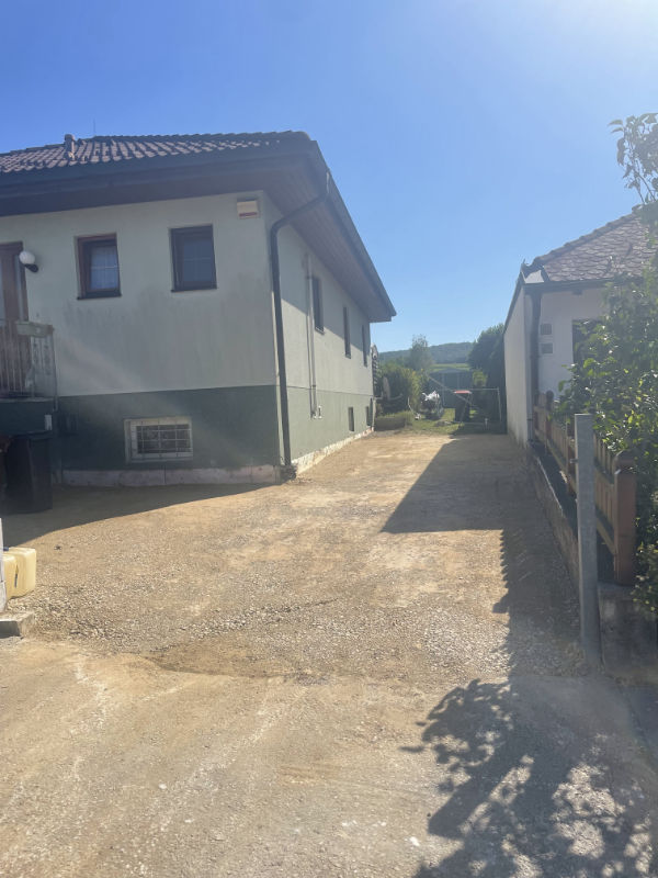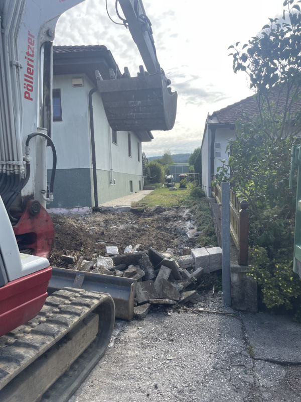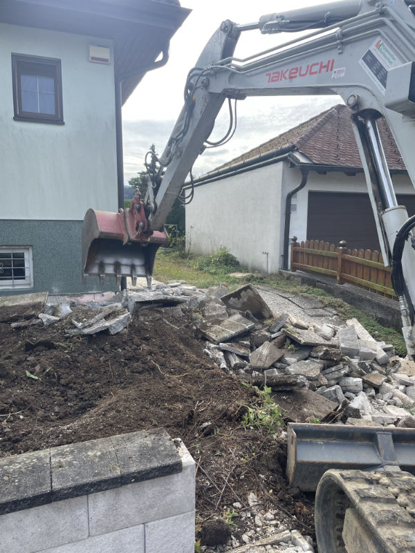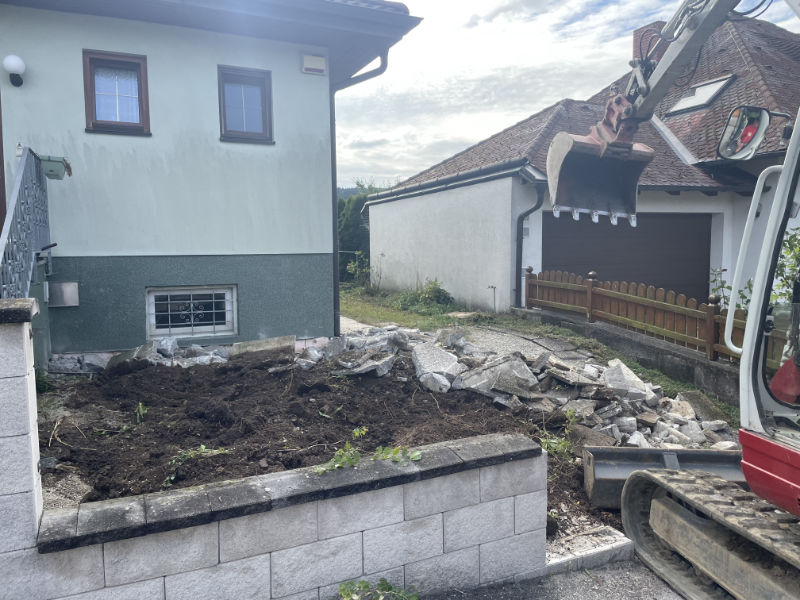 Am Vorplatz und seitlich vom Haus musste der Unterbau für die Verlegung von Pflastersteinen vorbereitet werden. Um den Platz entsprechend aufzubereiten wurden die bestehenden Betonflächen entfernt und entsorgt.